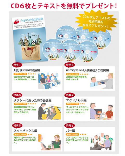 つまり教材内容としては『Hapa英会話』に海外旅行に関連の深いシチュエーション6編を追加したものが